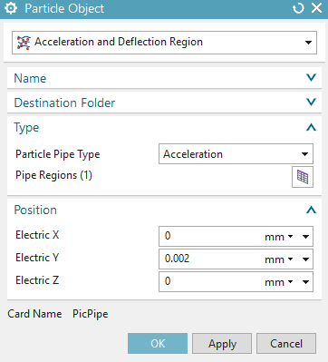 Finally, create an accelerator pipe. Again right click on ’Simulation Objects’ and ’New Simulation Object’; but now select ’Acceleration and Deflection Pipe’. Select the type to be ’Acceleration’ and assign an Electric Y field of 0.002 (this provides an \(E_y\) field of 0.002 \(\tfrac{\mathrm{V}}{\mathrm{m}}\)).