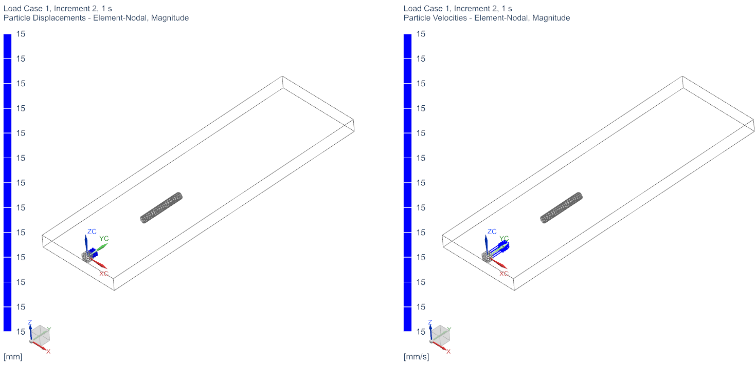 At \(t=0 \, \mathrm{sec}\) the particles are initialized in the source. Observe that the displacement plot does not show anything. This is because there are no displacements present. The Velocities are set to 15 \(\tfrac{\mathrm{mm}}{\mathrm{s}}\) as has been set.