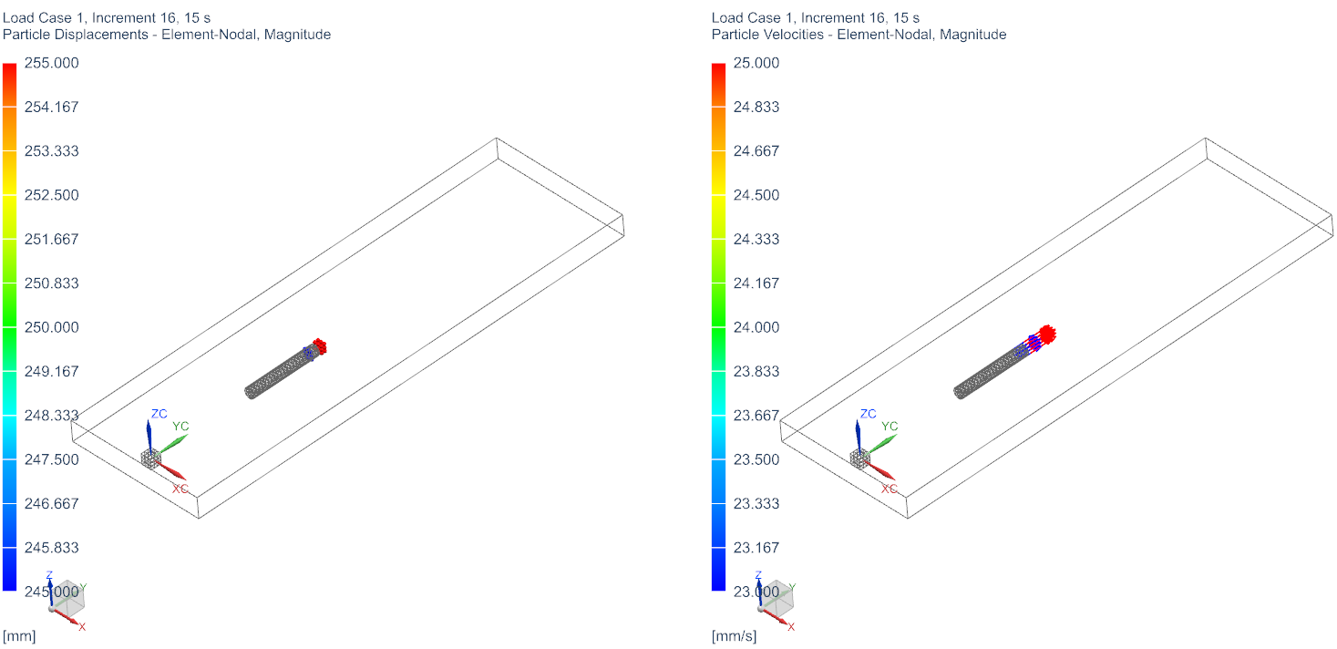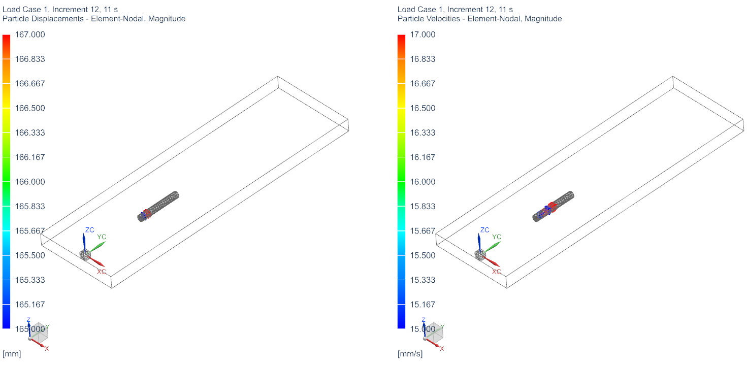 At \(t=11 \, \mathrm{sec}\) the particles in the first row have entered the accelerator pipe. We observe that the (max) velocity has changed to 17 \(\tfrac{\mathrm{mm}}{\mathrm{s}}\). Moreover the (max) displacement is now 167 \(\mathrm{mm}\).