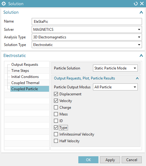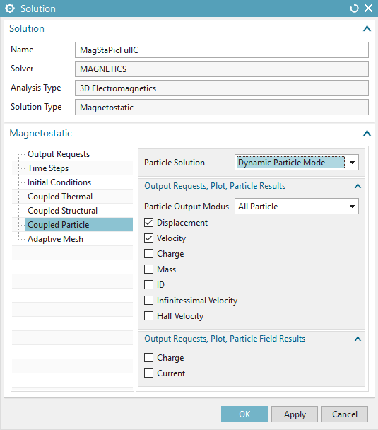 In register ’Coupled Particle’ set the ’Particle Solution’ to ’Dynamic Particle Mode’. With this selection the Particle Solver is uni-directionally coupled with the field solver, meaning that the EM fields accelerate/deflect the particles; but the particles do not impose any sources and currents. Also set the ’Particle Output Mode’ to ’All Particle’ and select ’Displacements’ and ’Velocity’ as Output.