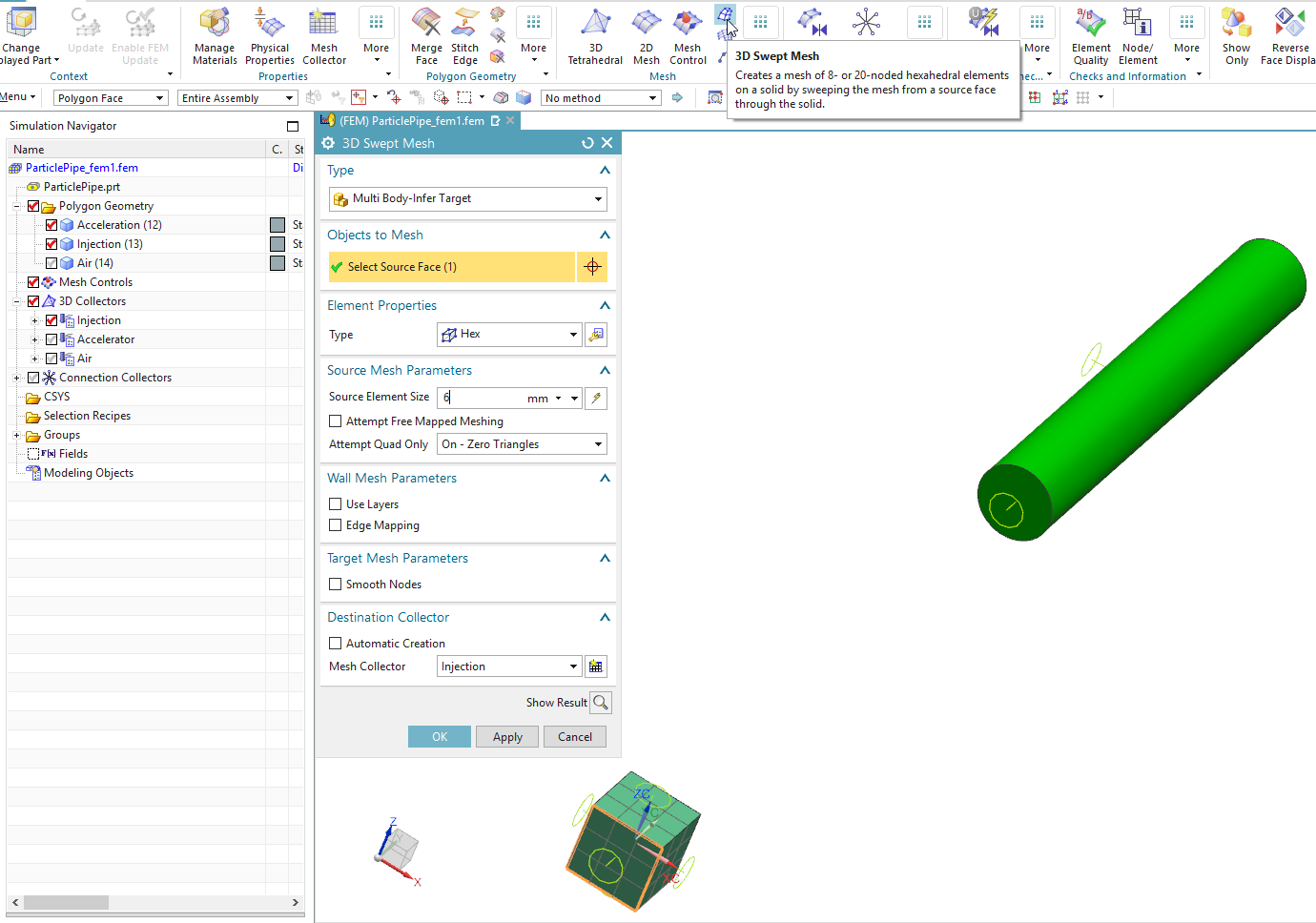 Mesh the injection source with a ’3D Swept Mesh’ of size 6mm; herein set the option ’Attempt Quad Only’ to ’On-Zero Triangles’. The meshing should result in a regular hex-mesh with a total of 27 Cells.