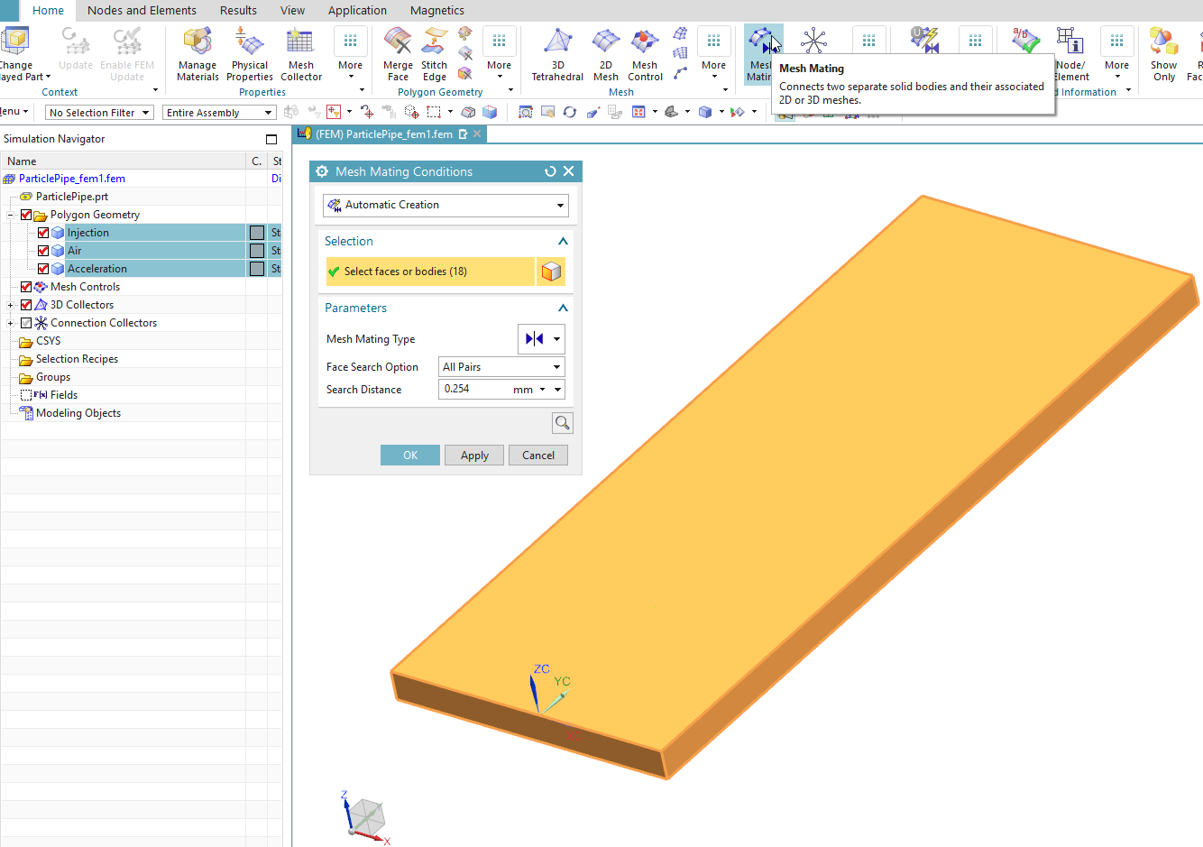 Mesh the accelerator pipe with a ’3D Tetrahedral’ mesh of size 9.1mm; or a finer mesh.