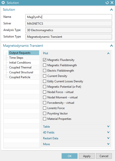 In register ’Output Requests’ under ’Plot’ activate ’Magnetic Fluxdensity’ to enable the calculation of the B field. Moreover, the Magnetic Potential (a-Pot) and ’Electric Fieldstrength’ might be interesting (but not vital) for this tutorial.