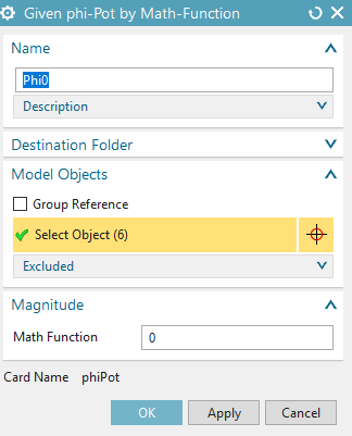 Now, create a \(\varphi=0\) boundary condition. To do so right click on ’Constraints’ and select ’Given phi-Pot by Math-Function’; then select the six faces of the air volume.