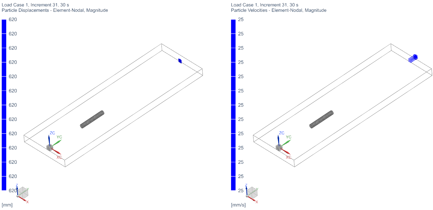 At \(t=11 \, \mathrm{sec}\) the particles in the first row have entered the accelerator pipe. We observe that the (max) velocity has changed to 17 \(\tfrac{\mathrm{mm}}{\mathrm{s}}\). Moreover the (max) displacement is now 167 \(\mathrm{mm}\).