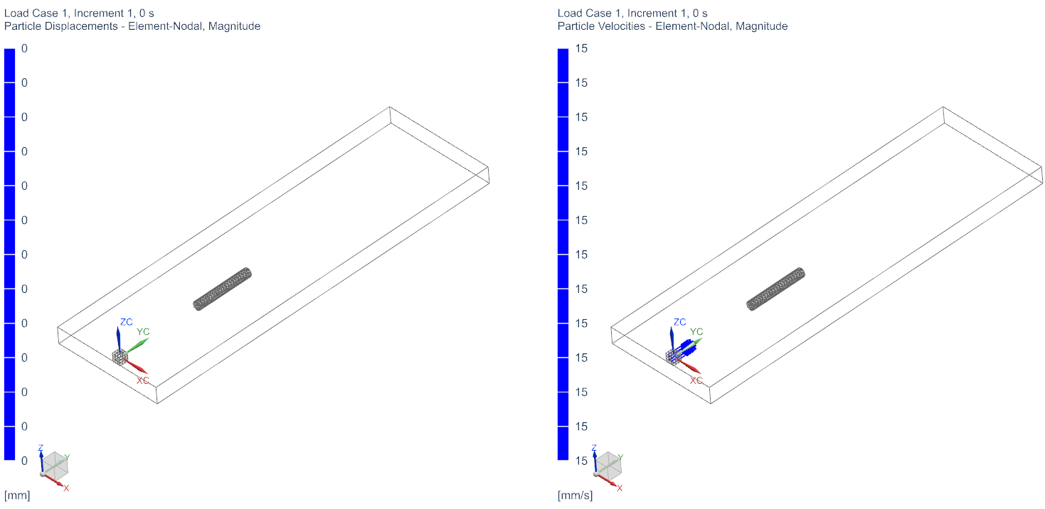At \(t=0 \, \mathrm{sec}\) the particles are initialized in the source. Observe that the displacement plot does not show anything. This is because there are no displacements present. The Velocities are set to 15 \(\tfrac{\mathrm{mm}}{\mathrm{s}}\) as has been set.