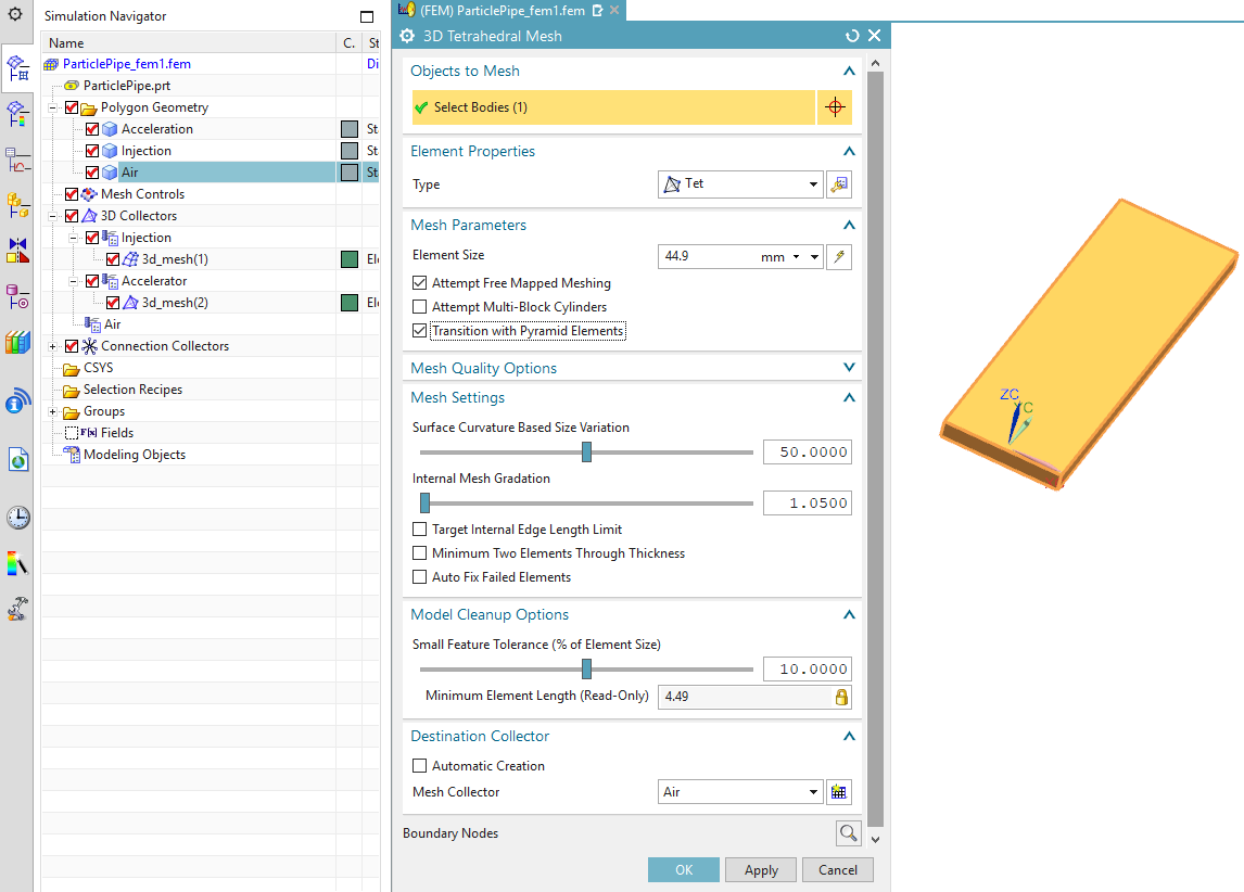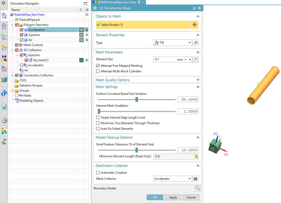 Mesh the accelerator pipe with a ’3D Tetrahedral’ mesh of size 9.1mm; or a finer mesh.