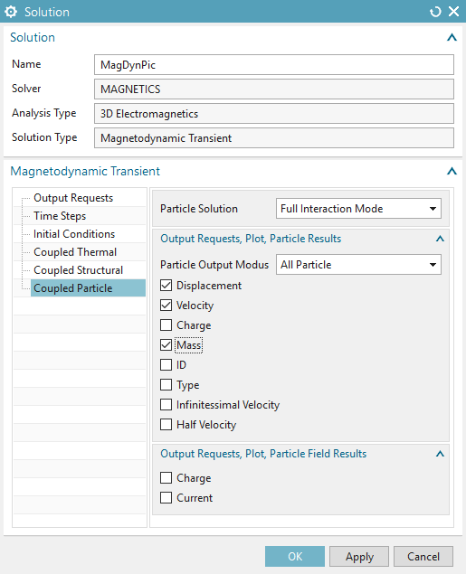 In register ’Coupled Particle’ set the ’Particle Solution’ to ’Full Interaction Mode’. With this selection the Particle Solver is bi-directionally coupled with the field solver, meaning that the EM fields accelerate/deflect the particles; and in turn the particles modify the sources and currents for the field solver (for more information THEORY). Also set the ’Particle Output Mode’ to ’All Particle’ and select ’Displacements’, ’Velocity’ and ’Mass’ as Output.